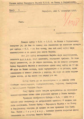 Saopćenje Glavnog odbora Narodnog Vijeća SHS za Bosnu i Hercegovinu o osnivanju kotarskih odbora Narodnog vijeća u Bosni i Hercegovini, 5. XI 1918.