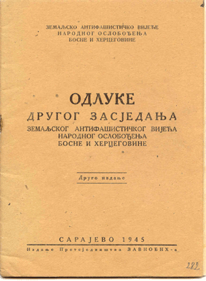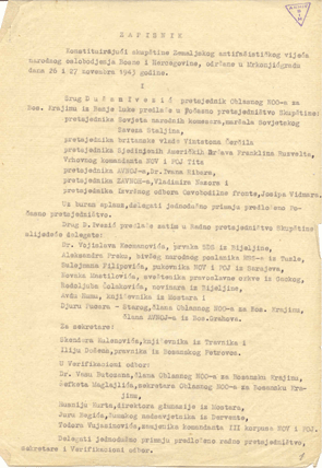 Prva stranica zapisnika Konstituirajuće skupštine ZAVNOBiH-a, u Mrkonjić Gradu, 26-27. XI 1943. i Odluke Drugog zasjedanja ZAVNOBiH |