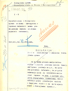 Okružnica o zvaničnom uvođenju naziva «Pokrajinska uprava za BiH», 21. VII 1921 | ||||