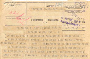 Telegram Narodnog Vijeća SHS o proglašenju ujedinjenja Države Srba, Hrvata i Slovenaca i imenovanju Odbora za organizaciju zajedničke države |